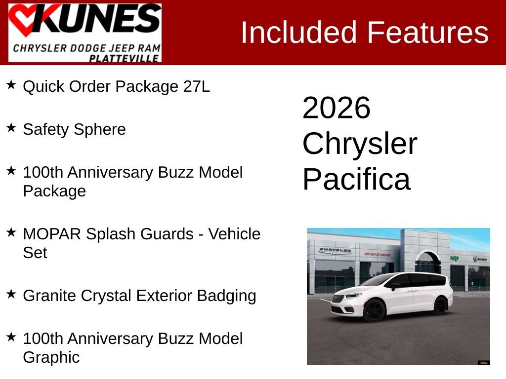 2026 Chrysler Pacifica Select Select FWD Bright White Clearcoat 100th Anniversary Buzz Model Graphic, 100th Anniversary Buzz Model Package, 360 Surround View Camera System, Black Day Light Opening Moldings, Front Splash Guards, Granite Crystal Exterior Accents, Granite Crystal Exterior Badging, MOPAR Splash Guards - Vehicle Set, ParkSense Front/Rear Park Assist with Stop, Premium Fascia-Upper/Lower Grilles/Granite Crystal, Premium Rear Fascia Granite Crystal, Quick Order Package 27L, Rear Splash Guards, Safety Sphere, Wheels: 20" x 7.5" Luster Gray Aluminum. 9-Speed 948TE Automatic 3.6L V6 24V VVT