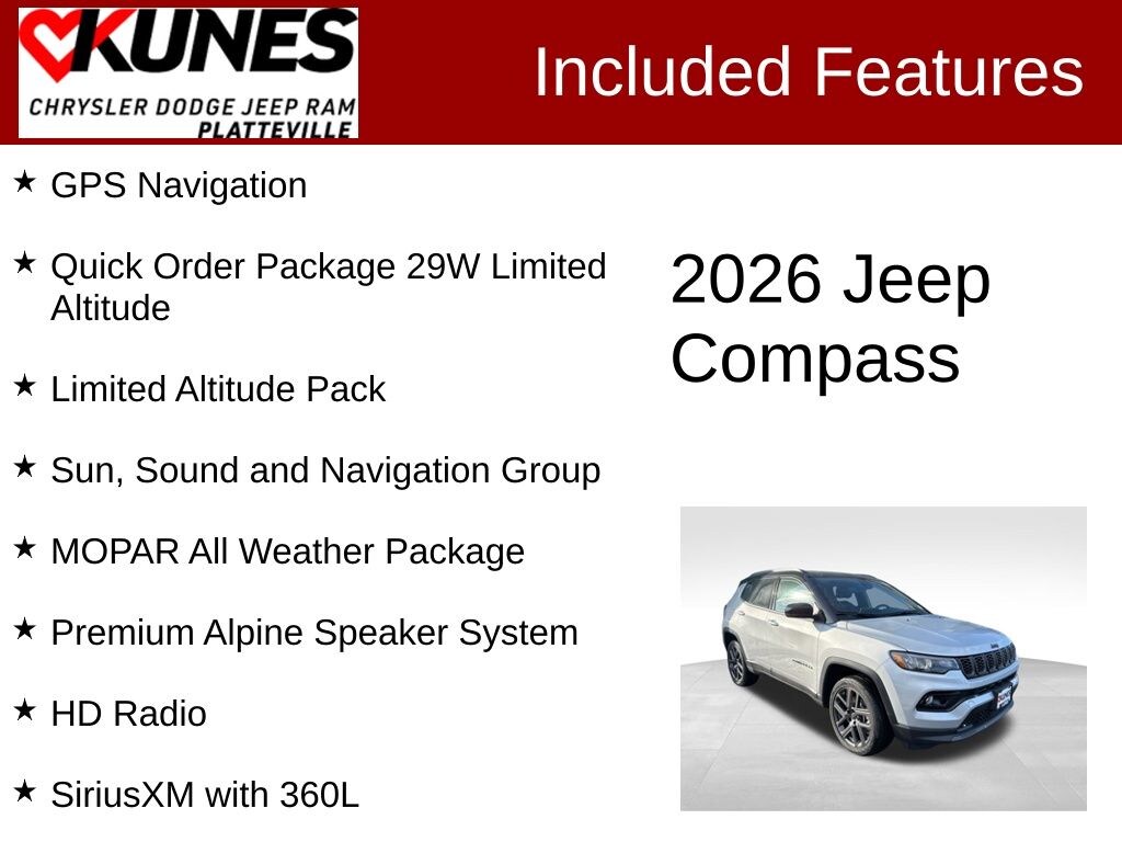 2026 Jeep Compass Limited Limited 4WD Dealer Discount of $1,462 off MSRP Silver Zynith Metallic Clearcoat 4WD, 10.1" Touchscreen Display, Alexa Built-In, Black Day Light Opening Moldings, Cluster 10.25" TFT Color Display, Connected Travel and Traffic Services, Gloss Black Surround/Neutral Gray Rings, GPS Navigation, HD Radio, Integrated Voice Command with Bluetooth, Limited Altitude Pack, MOPAR All Weather Package, MOPAR All-Weather Floor Mats, MOPAR Molded Cargo Tray, Neutral Gray Exterior Accents, Neutral Gray Exterior Badging, Piano Black Interior Accents, Power Front/Fixed Rear Full Sunroof, Premium Alpine Speaker System, Quick Order Package 29W Limited Altitude, SiriusXM with 360L, Sun, Sound and Navigation Group, Wheels: 19" x 7.5" Aluminum Painted. 8-Speed Automatic 2.0L I4 DOHC