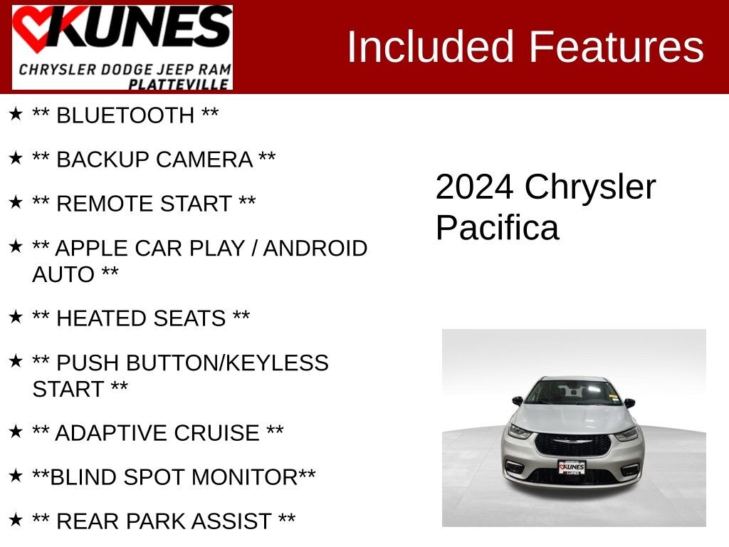 2024 Chrysler Pacifica Touring L Certified. Recent Arrival! Priced below KBB Fair Purchase Price! CARFAX One-Owner. Clean CARFAX. Silver Mist Clearcoat 3.6L V6 24V VVT FWD ** BLUETOOTH **, ** BACKUP CAMERA **, ** REMOTE START **, ** APPLE CAR PLAY / ANDROID AUTO **, ** HEATED SEATS **, ** PUSH BUTTON/KEYLESS START **, ** ADAPTIVE CRUISE **, **BLIND SPOT MONITOR**, ** REAR PARK ASSIST **, ** SIRIUSXM RADIO **, ** POWER REAR LIFTGATE **, 6 Speakers, Alloy wheels, AM/FM radio: SiriusXM, Caprice Leatherette Bucket Seats, Delay-off headlights, Disassociated Touchscreen Display, Driver vanity mirror, Driver's Seat Mounted Armrest, Front anti-roll bar, Front Bucket Seats, Fully automatic headlights, GPS Antenna Input, Illuminated entry, Integrated Active Noise Cancellation, Integrated Center Stack Radio, Occupant sensing airbag, Overhead airbag, Overhead console, Panic alarm, Passenger door bin, Passenger seat mounted armrest, Passenger vanity mirror, Quick Order Package 27L, Radio data system, Radio: Uconnect 5 w/10.1" Display, Rear reading lights, Rear window wiper, Reclining 3rd row seat, Split folding rear seat, USB Host Flip, Variably intermittent wipers, Voltmeter.