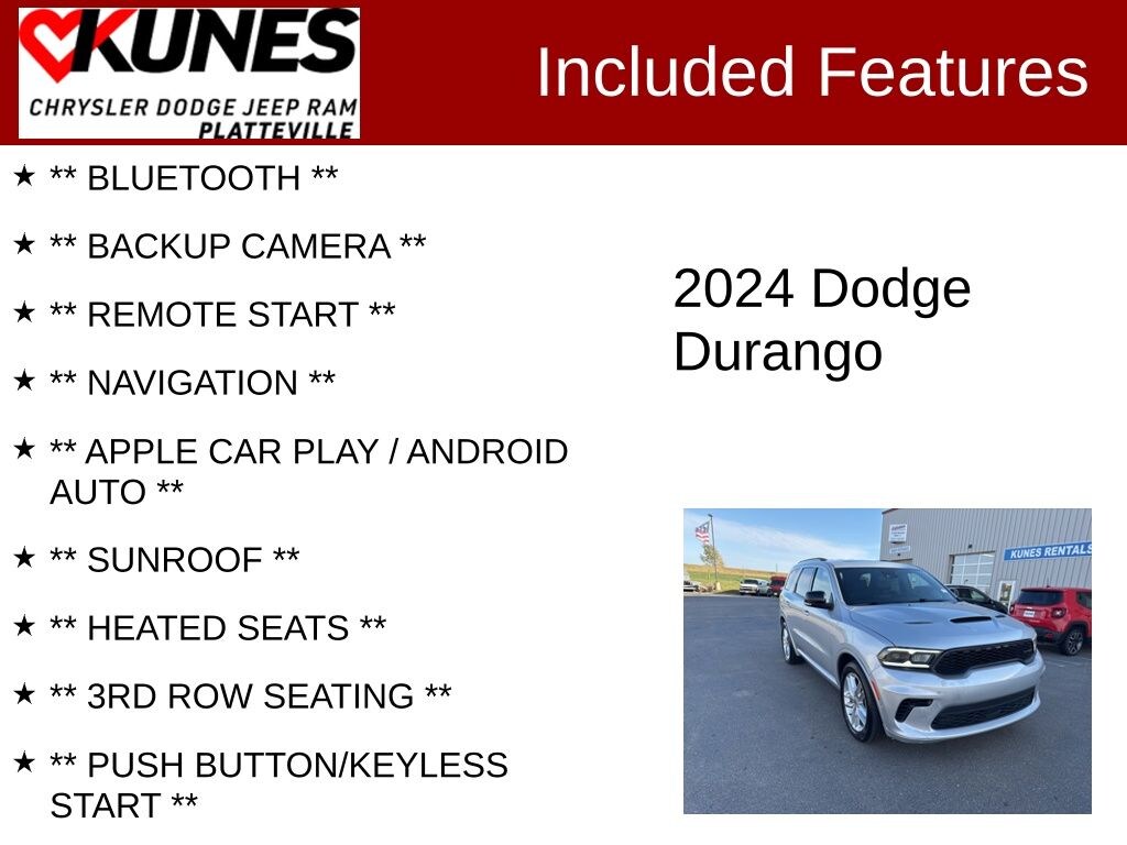 2024 Dodge Durango R/T Plus Certified. CARFAX One-Owner. Clean CARFAX. Triple Nickel HEMI 5.7L V8 Multi Displacement VVT AWD ** BLUETOOTH **, ** BACKUP CAMERA **, ** REMOTE START **, ** NAVIGATION **, ** APPLE CAR PLAY / ANDROID AUTO **, ** SUNROOF **, ** HEATED SEATS **, ** 3RD ROW SEATING **, ** PUSH BUTTON/KEYLESS START **, ** ADAPTIVE CRUISE **, **TOW PACKAGE**, **BLIND SPOT MONITOR**, ** REAR PARK ASSIST **, ** SIRIUSXM RADIO **, ** ADVANCED SAFETY Tech **, ** COOLED SEATS **, ** LEATHER SEATS **, ** POWER REAR LIFTGATE **, ** ALL WHEEL DRIVE **, AWD, 115V Auxiliary Power Outlet, 3rd row seats: split-bench, 7 & 4 Pin Wiring Harness, 9 Speakers, Adaptive Cruise Control w/Stop, Alloy wheels, Auto-Dimming Exterior Driver Mirror, Auto-leveling suspension, Black Roof Rails, Blind Spot w/Trailer Detection, Bumpers: body-color, Class IV Receiver Hitch, Cloth Bucket Seats w/Shift Insert, Delay-off headlights, Dual Remote USB Port - Charge Only, Exterior Mirrors w/Heating Element, Exterior Mirrors w/Memory, Exterior Mirrors w/Supplemental Signals, Floor Console w/Leather Armrest, Front Bucket Seats, Front Center Armrest w/Storage, Front reading lights, Gloss Black Exterior Mirrors, Heated front seats, Heated steering wheel, Illuminated entry, Integrated Roof Rail Crossbars, Leather Trimmed Bucket Seats, Leather Wrapped Door Panels, LED Auxiliary Low Beam & Turn Signal, Navigation system: TomTom, Outside temperature display, Overhead console, Passenger door bin, Power 6x9 Multi-Function Foldaway Mirrors, Power 8-Way Driver Memory 8-Way Passenger Seats, Power door mirrors, Power driver seat, Power Driver/Passenger 4-Way Lumbar Adjust, Power Liftgate, Power Tilt & Telescopic Steering Column, Radio: Uconnect 5 Nav w/10.1" Display, Radio/Driver Seat/Mirrors Memory, Rain sensing wipers, Rear anti-roll bar, Rear Load Leveling Suspension, Rear reading lights, Rear window wiper, Red Accent Stitching, Speed control, Speed-Sensitive Wipers, Split folding rear seat, Sport steering wheel, Steering wheel mounted audio controls, Tachometer, Telescoping steering wheel, Tilt steering wheel, Trailer Brake Control, Variably intermittent wipers, Ventilated Front Seats, Voltmeter, Wheels: 20" x 8.0" Fine Silver.