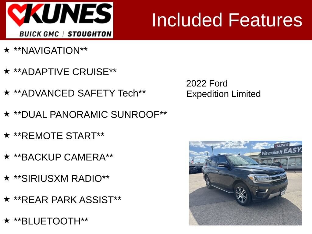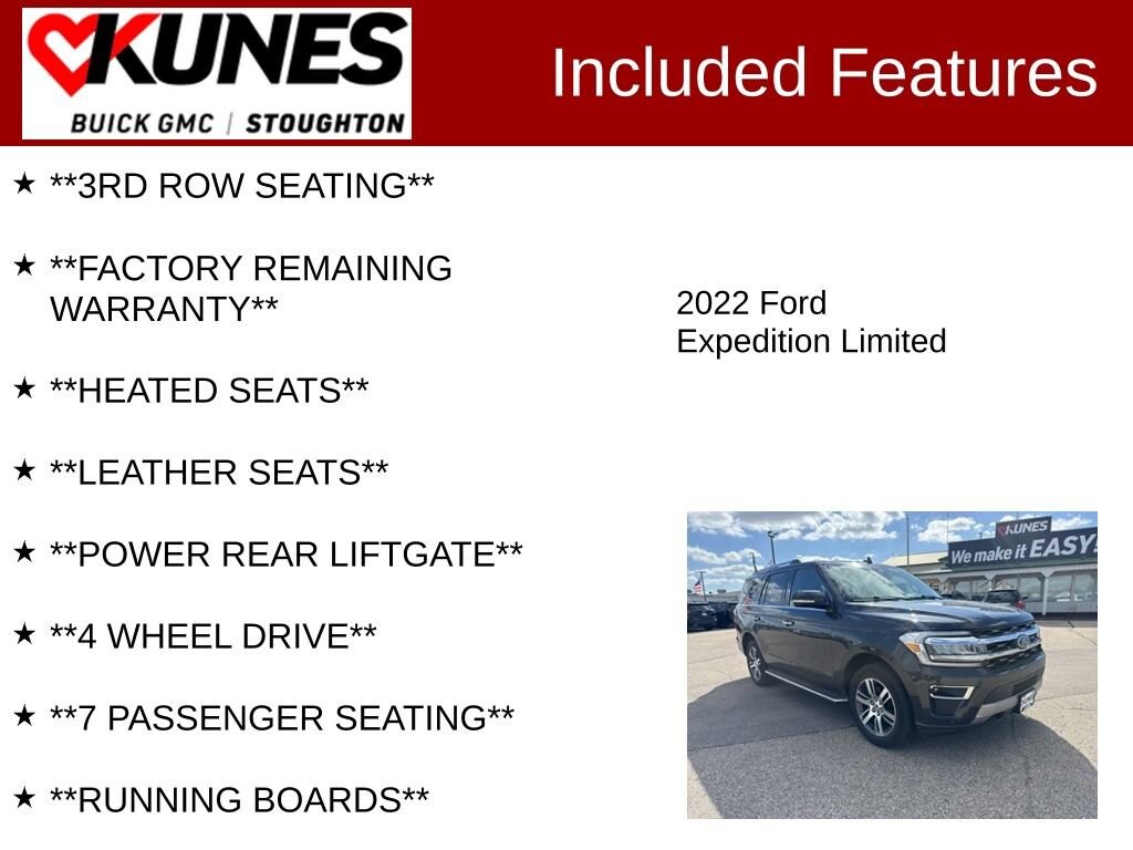 **NAVIGATION**, **ADAPTIVE CRUISE**, **ADVANCED SAFETY Tech**, **DUAL PANORAMIC SUNROOF**, **REMOTE START**, **BACKUP CAMERA**, **SIRIUSXM RADIO**, **REAR PARK ASSIST**, **BLUETOOTH**, **3RD ROW SEATING**, **FACTORY REMAINING WARRANTY**, **HEATED SEATS**, **LEATHER SEATS**, **POWER REAR LIFTGATE**, **4 WHEEL DRIVE**, **7 PASSENGER SEATING**, **RUNNING BOARDS**, **FACTORY 5 YEAR/60,000 MILE POWERTRAIN/ENGINE WARRANTY REMAINING**, 4WD, 12 Speakers, 3.31 Axle Ratio, 4-Wheel Disc Brakes, ABS brakes, Active Park Assist 2.0, Alloy wheels, Auto High-beam Headlights, Auto-dimming door mirrors, Auto-dimming Rear-View mirror, Brake assist, Bumpers: body-color, Compass, Delay-off headlights, Driver door bin, Driver vanity mirror, Dual front impact airbags, Dual front side impact airbags, Emergency communication system: SYNC 4 911 Assist, Equipment Group 301A Mid Package, Four wheel independent suspension, Front anti-roll bar, Front Center Armrest, Front reading lights, Fully automatic headlights, Heated rear seats, Illuminated entry, Leather steering wheel, Low tire pressure warning, Memory seat, Navigation system: Connected Navigation, Occupant sensing airbag, Outside temperature display, Overhead airbag, Overhead console, Panic alarm, Panoramic Vista Roof, Passenger door bin, Passenger vanity mirror, Power door mirrors, Power driver seat, Power Liftgate, Power moonroof, Power passenger seat, Power steering, Power windows, Radio data system, Rain sensing wipers, Rear air conditioning, Rear anti-roll bar, Rear reading lights, Rear window defroster, Rear window wiper, Reclining 3rd row seat, SiriusXM w/360L, Speed control, Speed-sensing steering, Speed-Sensitive Wipers, Split folding rear seat, Spoiler, Steering wheel memory, Steering wheel mounted audio controls, SYNC 4 w/Enhanced Voice Recognition, Telescoping steering wheel, Tilt steering wheel, Traction control, Trip computer, Turn signal indicator mirrors, Ventilated front seats, Voltmeter, Wheels: 20 Bright Machined Aluminum. Limited