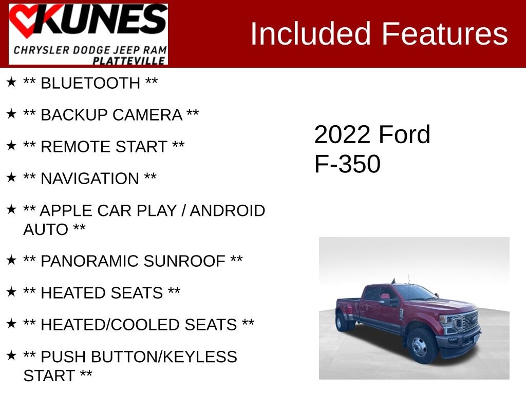 2022 Ford F-350SD King Ranch DRW Certified. Recent Arrival! Priced below KBB Fair Purchase Price! Odometer is 844 miles below market average! CARFAX One-Owner. Brown DRW Power Stroke 6.7L V8 DI 32V OHV Turbodiesel 4WD ** BLUETOOTH **, ** BACKUP CAMERA **, ** REMOTE START **, ** NAVIGATION **, ** APPLE CAR PLAY / ANDROID AUTO **, ** PANORAMIC SUNROOF **, ** HEATED SEATS **, ** HEATED/COOLED SEATS **, ** PUSH BUTTON/KEYLESS START **, ** RUNNING BOARDS **, ** ADAPTIVE CRUISE **, **TOW PACKAGE**, **BLIND SPOT MONITOR**, ** REAR PARK ASSIST **, ** SIRIUSXM RADIO **, ** ADVANCED SAFETY Tech **, ** FACTORY REMAINING WARRANTY **, ** COOLED SEATS **, ** LEATHER SEATS **, ** 4 WHEEL DRIVE **, ** FULL 4 DOOR CREW CAB **, ** FACTORY 3 YEAR/36,000 MILE COMPREHENSIVE WARRANTY REMAINING **, ** FACTORY 5 YEAR/60,000 MILE POWERTRAIN/ENGINE WARRANTY REMAINING **, 4WD, 5th Wheel/Gooseneck Hitch Prep Package, Front Splash Guards/Mud Flaps (Pre-Installed), FX4 Off-Road Package, GVWR: 14,000 lb Payload Package, Hill Descent Control, King Ranch Ultimate Package, Multi-Contour Seats, Off-Road Specifically Tuned Shock Absorbers, Order Code 623A, Power-Deployable Running Boards, Quad Beam LED Headlamps & LED Taillamps, Rear anti-roll bar, Twin Panel Power Moonroof, Unique FX4 Off-Road Box Decal.