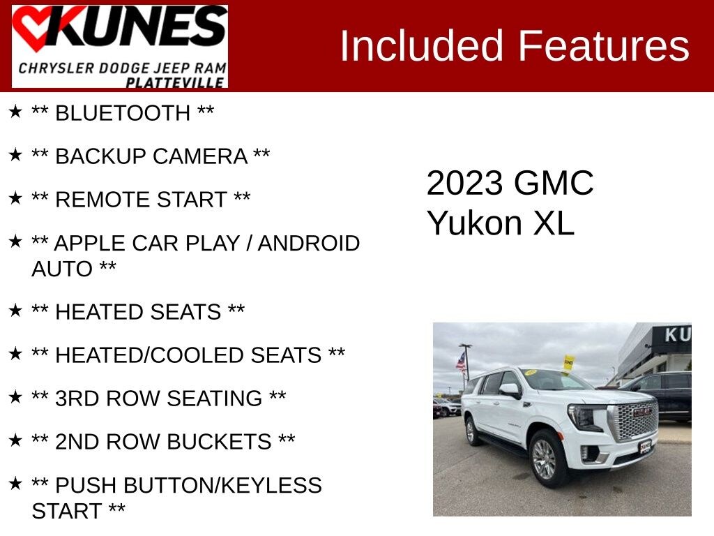 2023 GMC Yukon XL Denali Certified. Priced below KBB Fair Purchase Price! Odometer is 2883 miles below market average! CARFAX One-Owner. Clean CARFAX. Summit White EcoTec3 6.2L V8 4WD ** BLUETOOTH **, ** BACKUP CAMERA **, ** REMOTE START **, ** APPLE CAR PLAY / ANDROID AUTO **, ** HEATED SEATS **, ** HEATED/COOLED SEATS **, ** 3RD ROW SEATING **, ** 2ND ROW BUCKETS **, ** PUSH BUTTON/KEYLESS START **, ** RUNNING BOARDS **, ** ADAPTIVE CRUISE **, **TOW PACKAGE**, **BLIND SPOT MONITOR**, ** REAR PARK ASSIST **, ** SIRIUSXM RADIO **, ** FACTORY REMAINING WARRANTY **, ** COOLED SEATS **, ** LEATHER SEATS **, ** POWER REAR LIFTGATE **, ** 4 WHEEL DRIVE **, ** 7 PASSENGER SEATING **, ** PREFERRED PACKAGE **, ** LUXURY PACKAGE **, ** FACTORY 5 YEAR/60,000 MILE POWERTRAIN/ENGINE WARRANTY REMAINING **, 4WD, 15" Diagonal Multi-Color Head-Up Display, 2 Presets For Outside Rearview Mirrors, 3 Years of GMC Connected Services, 3 Years of OnStar Safety & Security, 3rd Row 60/40 Power-Folding Split-Bench Seat, Air Ride Adaptive Suspension, Bose 14-Speaker Surround w/CenterPoint, Bright Front & Rear Door Sill Plates, Chrome Door Handles w/Body-Color Strip, Dual Exhaust System, Electronic Limited Slip Differential (eLSD), Enhanced Automatic Emergency Braking, Floor Console, Galvano Bodyside Moldings, Hands-Free Power Programmable Rear Liftgate, HD Surround Vision, Heated & Ventilated Driver & Front Passenger Seats, Heated 2nd Row Outboard Position Seats, Heated Driver & Front Passenger Seats, Heated Steering Wheel, Hill Descent Control, Inside Rear-View Auto-Dimming Mirror, License Plate Front Mounting Package, Outside Heated Power-Adjustable Mirrors, Power Release 2nd Row Bucket Seats, Power Tilt & Telescopic Steering Column, Preferred Equipment Group 5SA, Premium Capability Package w/Active Response 4WD, Rear Pedestrian Alert, Safety Alert Seat, Universal Home Remote, Wireless Charging.