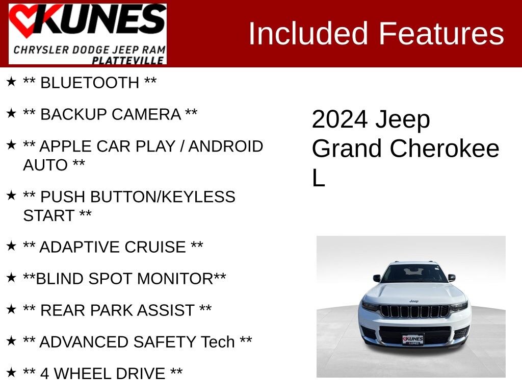 2024 Jeep Grand Cherokee L Laredo Certified. Recent Arrival! CARFAX One-Owner. Bright White Clearcoat 3.6L V6 24V VVT 4WD ** BLUETOOTH **, ** BACKUP CAMERA **, ** APPLE CAR PLAY / ANDROID AUTO **, ** PUSH BUTTON/KEYLESS START **, ** ADAPTIVE CRUISE **, **BLIND SPOT MONITOR**, ** REAR PARK ASSIST **, ** ADVANCED SAFETY Tech **, ** 4 WHEEL DRIVE **, 3rd row seats: split-bench, Emergency communication system, Manual Fold Seatbacks, Occupant sensing airbag, Quick Order Package 23A Laredo, Rear anti-roll bar, Rear window wiper, Reclining 3rd row seat, Speed-Sensitive Wipers, Split folding rear seat.