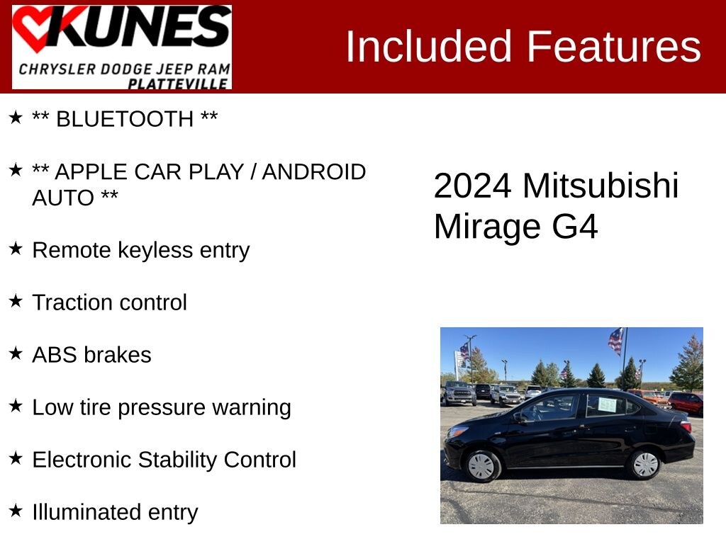 2024 Mitsubishi Mirage G4 ES Certified. Odometer is 16355 miles below market average! Clean CARFAX. Black 1.2L 3-Cylinder DOHC MIVEC FWD ** BLUETOOTH **, ** APPLE CAR PLAY / ANDROID AUTO **, ABS brakes, Electronic Stability Control, Illuminated entry, Low tire pressure warning, Remote keyless entry, Traction control.