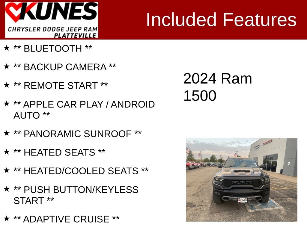 ⢠TRX Level 2 Equipment Group: leather seats, heated and cooled front seats, heated rear seats, memory driver's seat, navigation, rear parking sensors, backup camera, blind spot monitoring, cross-traffic alert, powered adjustable pedals, premium audio, remote start, and more.