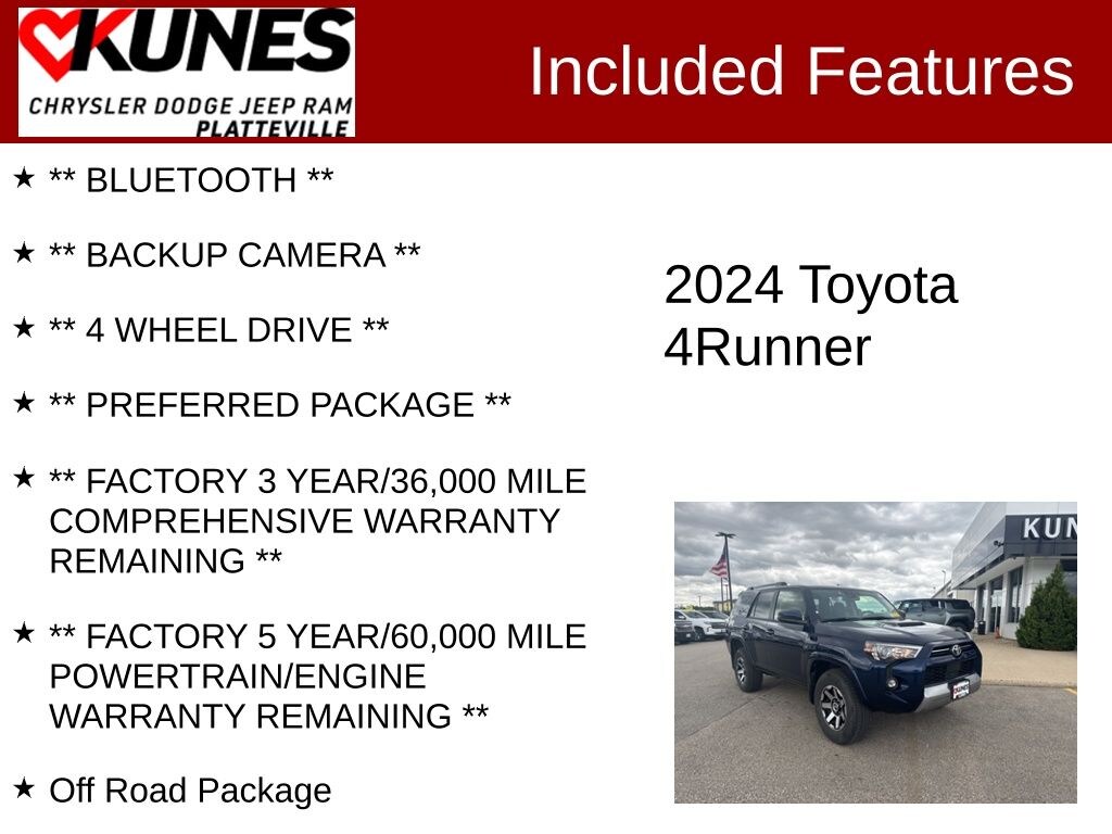 2024 Toyota 4Runner TRD Off-Road Certified. Priced below KBB Fair Purchase Price! Odometer is 875 miles below market average! CARFAX One-Owner. Clean CARFAX. Blue 4.0L V6 DOHC 24V 4WD ** BLUETOOTH **, ** BACKUP CAMERA **, ** 4 WHEEL DRIVE **, ** PREFERRED PACKAGE **, ** FACTORY 3 YEAR/36,000 MILE COMPREHENSIVE WARRANTY REMAINING **, ** FACTORY 5 YEAR/60,000 MILE POWERTRAIN/ENGINE WARRANTY REMAINING **, 4WD, Black/Graphite w/Fabric Seat Trim, Black Roof Rails, Off Road Package.
